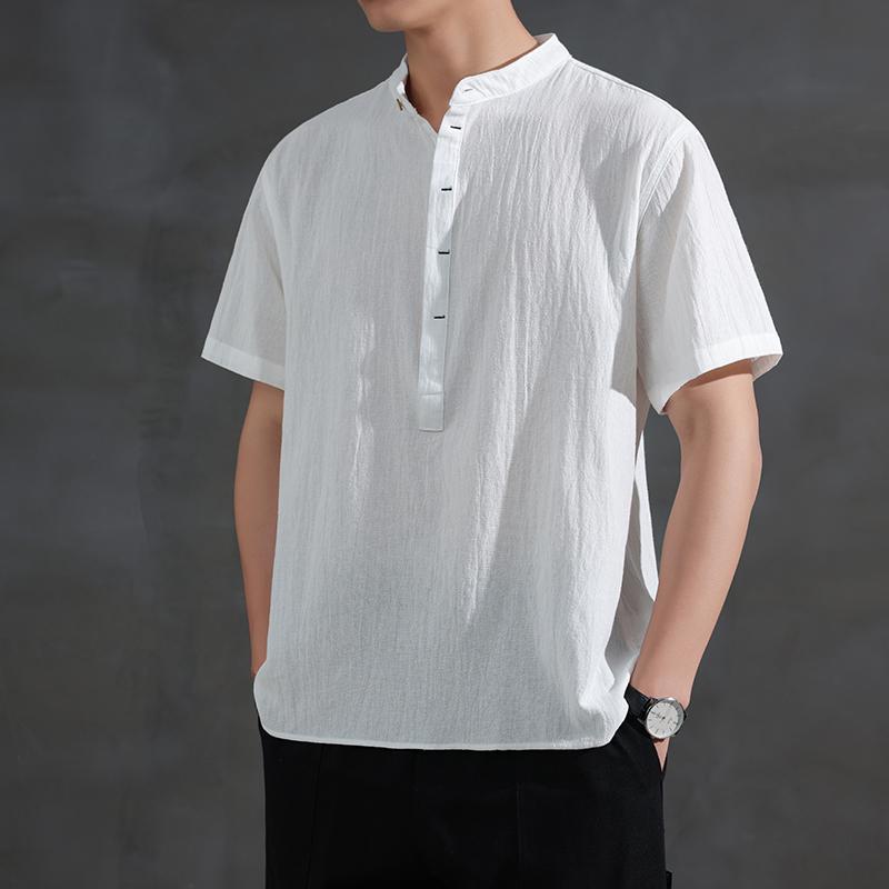 シャツ メンズ トップス 男性用 スタンドカラー 立ち襟 半袖 綿麻 コットンリネン カジュアル 普段使い 無地 ウォッシャブル 春夏 涼感