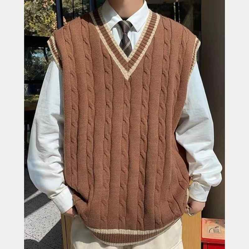 ニットベスト 男性用 Vネック 学院風 配色 薄手 ポリエステル リラックスフィット 白 黒 茶色