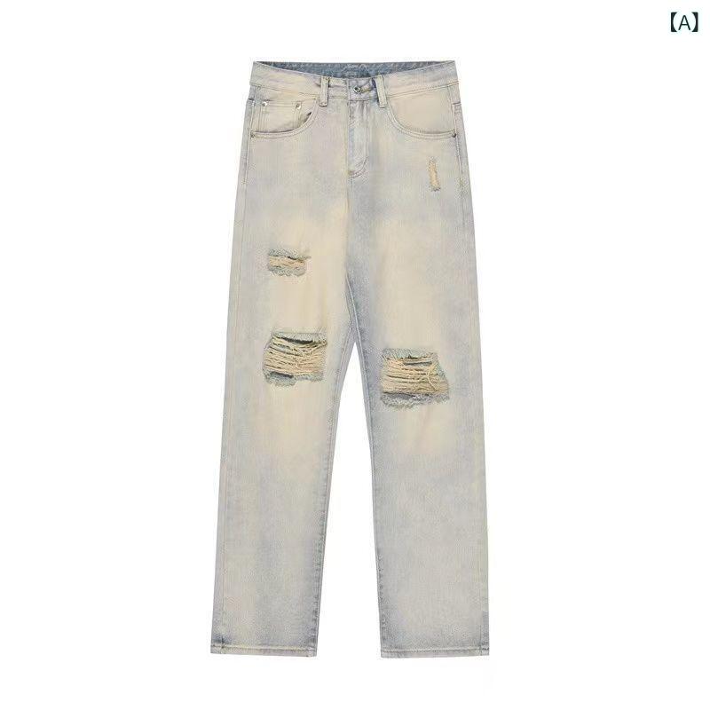 ・カテゴリ: デニムパンツ・スタイル: ルーズストレート・丈: フルレングス・ウエスト: ミッドライズ・フロント: ドローストリング・裏地: 裏起毛・対象: プラスサイズ・主な素材: 綿・生地: デニム・伸縮性: 高い・加工: ウォッシュ加工・カラー: ダメージ加工、ウォッシュドイエローブルー・サイズ展開: S、M、L、XL、XXL・対象年齢: 成人・性別: メンズ