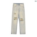 デニムパンツ メンズ アメリカン ストリート系 ダメージ クラッシュ 薄手 ルーズフィット ストレート ワイドシルエット コットン ストレッチ ウォッシュ加工 フェードブルー カジュアル 普段使い ビッグサイズ