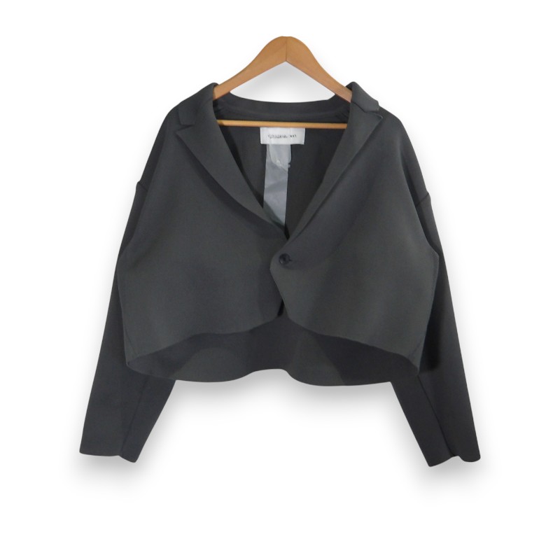 商品説明色 ブラック/ホワイト サイズ 表記:L 着丈(襟の付け根から):79cm 身幅(脇下の位置で):75cm 肩幅:60cm 袖丈(肩の縫い目から):60cm 素材 ポリエステル46% レーヨン34% アクリル17% ポリウレタン3% 生産国 日本 コメント 吸湿発熱性による暖かさと、裏起毛ならではのやわらかな肌触りが魅力の素材を使用した1着です。 内タグはございません。製品では肩パットが内蔵されておりますが、こちらは肩パットがございません。 状態説明 展示のみの超美品です。