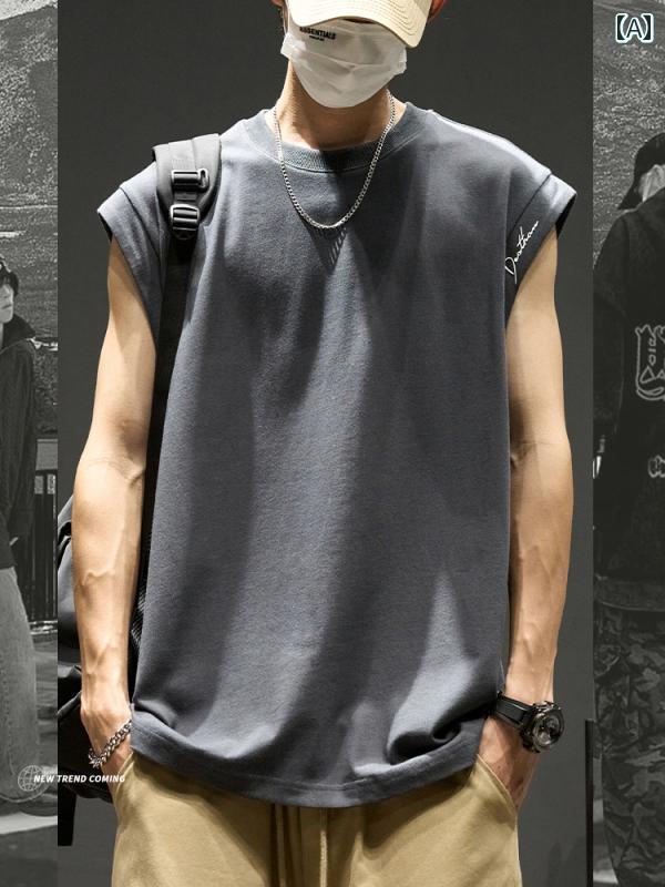 ノースリーブ メンズ シンプル フィットネス ランニング スポーツ ストレートヘム コットン スウェット 夏 ラウンドネック プルオーバー 綿 ジム