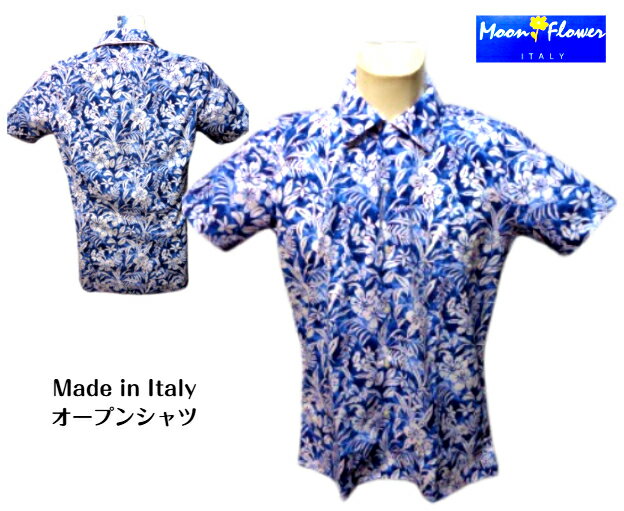 イタリア Moon Flower ボタニカル半袖シャツ メンズ 半袖オープンシャツ 2025 春夏 青 ブルー イタリア製 紳士服 プリントシャツ オープンカラー MADE IN ITALY ムーンフラワー