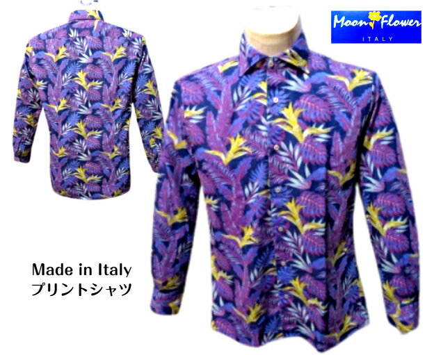 イタリア Moon Flower ボタニカルシャツ メンズ プリントシャツ 2025 春夏 紺 紫 イタリア製 紳士服 プリントシャツ セミワイドカラー MADE IN ITALY ムーンフラワー