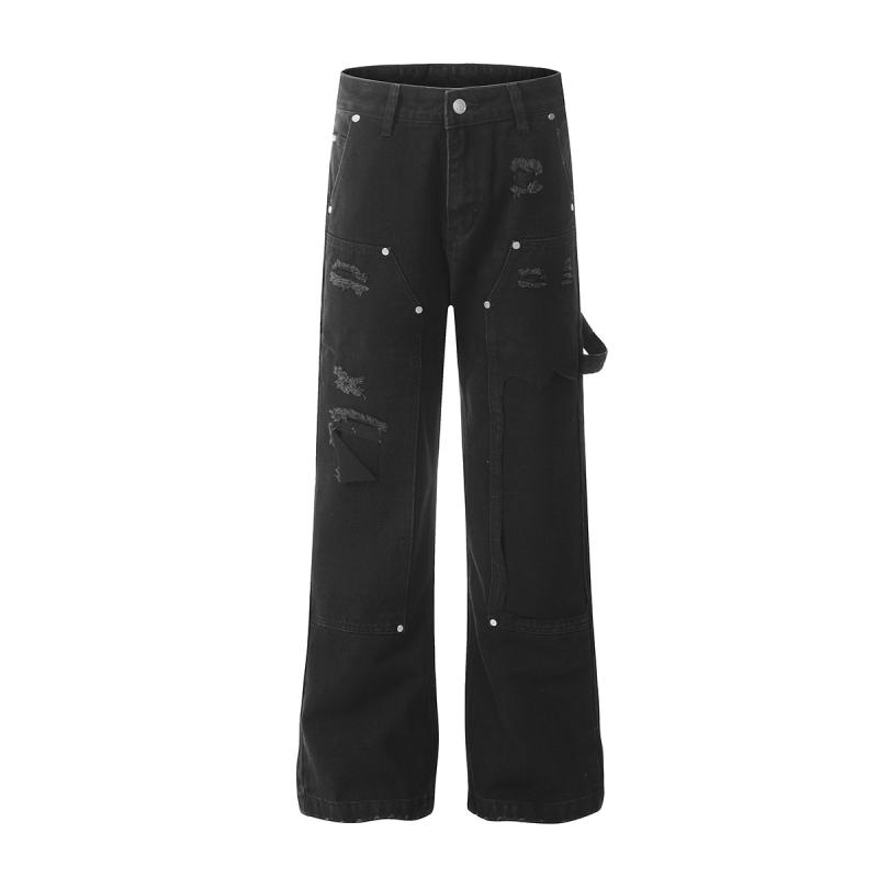 ジーンズ メンズ レトロ ウォッシュ加工 ユーズド加工 ダメージ加工 ヒゲ加工 黒 ストレート リベット ワークパンツ コットン ミッドウエスト ルーズフィット カジュアル