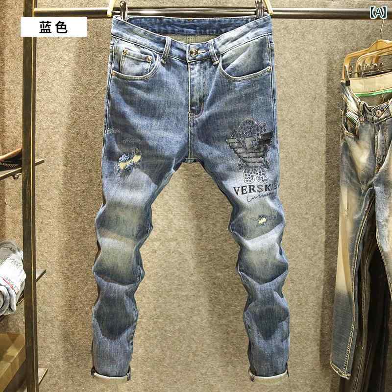 デニムパンツ オールシーズン 高級感 メンズ ジーンズ スリム フィット パンツ メンズ ホール パッチ ストレッチ デニム ひげ 穴 ロング ストレートレッグ