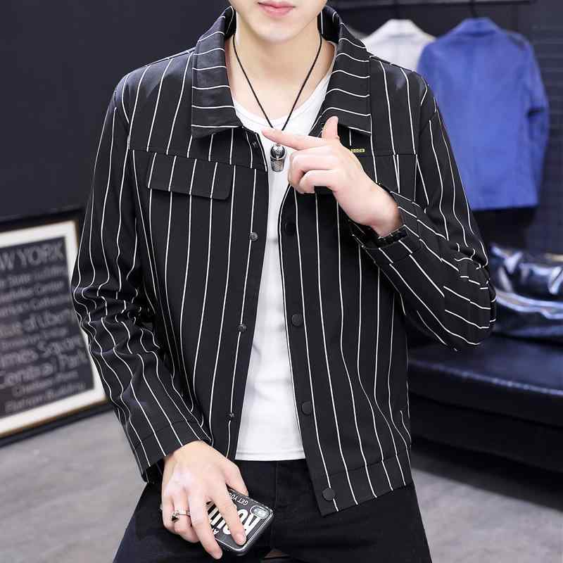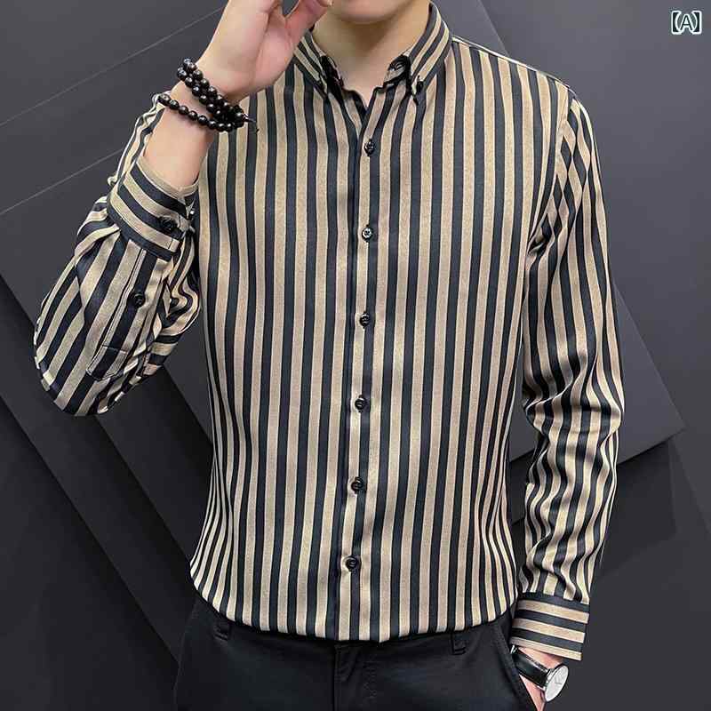 シャツ メンズ カジュアル スタイリッシュ 韓国 ストライプ トップス 秋 長袖 スリムフィット シングルブレスト おしゃれ レトロ