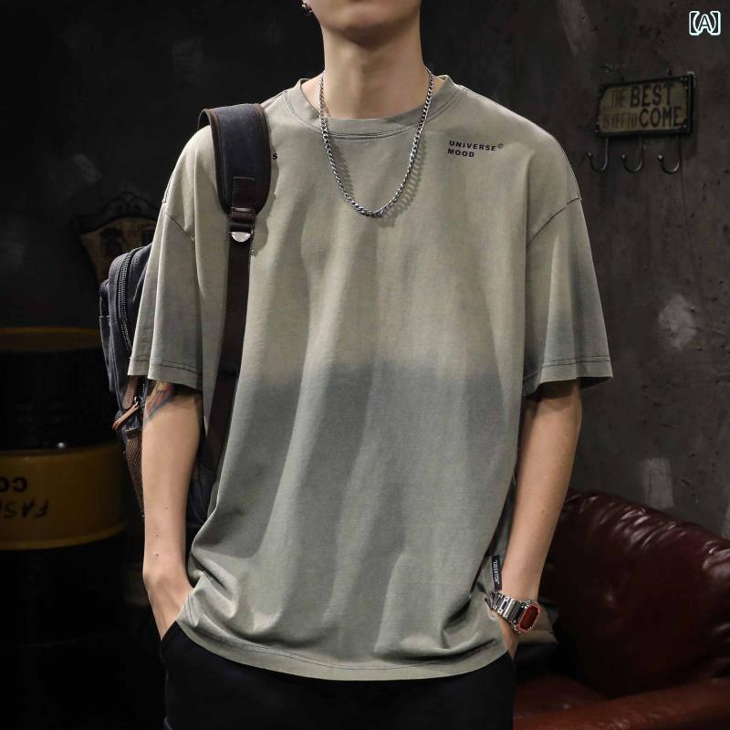 メンズ 男性用 ファッション オシャレ シンプル 大人 かっこいい ストリート ヒップホップ HipHop アメリカン レトロ 半袖 T シャツ 夏 グラデーションプリント T シャツ ゆったり 大きいサイズ ウォッシュド コットン カジュアル トップス