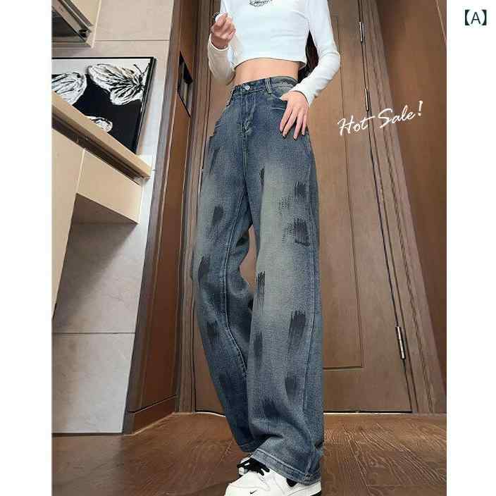 デニムパンツ ユニセックス 春秋 グラデーション グラフィティ ペイント ストレートシルエット ウォッシュ加工 綿 コットン 微ストレッチ アメカジ ハイストリート カジュアル 普段使い ブルー系