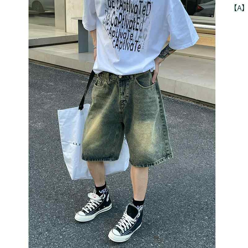ダメージ加工 ゆったりシルエット ウォッシュ加工 デニム ショートパンツ メンズ PAI アメリカン レトロ オールド ウェイスト スタイル イエロー マッド カラー デニムショートパンツ メンズ 夏 カジュアル ショート パンツ