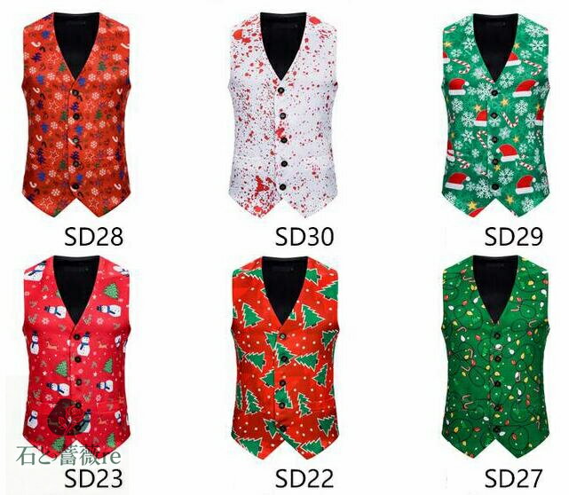 クリスマス元素ベスト ジレ メンズベスト クリスマスコスプレ衣装 プリント 雪だるま柄 サンタクロース柄 6タイプ クリスマスツリー柄 ジレベスト カラオケ イベント 二次会 Christmasパーティー仮装コスチューム