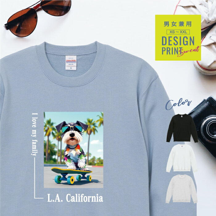 愛犬 スウェット トレーナー 犬 シュナウザー ソルト ペッパー スケボー 西海岸 スクエア プリント 上 服 プレゼント 誕生日 父の日 母の日 敬老の日 ギフト メンズ レディース カジュアル トップス 大きい サイズ 有り ブランド シンプル アウトドア
