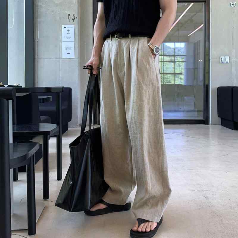 メンズ コーデ ファッション 春 秋 夏 Bishe コットン リネン フロアレングス パンツ 韓国 汎用性 高さ ストレート カジュアル シンプル ソルト レトロ ハイエンド 細い