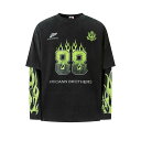 Tシャツ メンズ ヴィンテージ風 ウォッシュ加工 ファイヤー ロゴプリント 長袖 トップス レトロ ストリートスタイル コットン混紡 ゆったり 春秋 ブラック グレーブルー