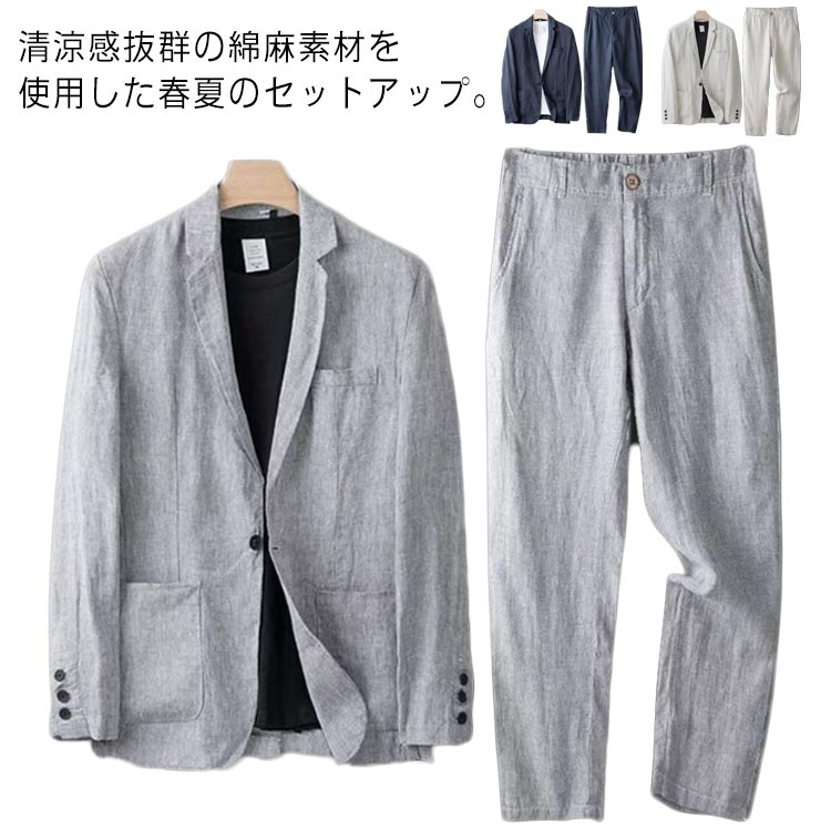 サマージャケット メンズ セットアップ 綿麻素材 テーラードジャケット 長ズボン 上下セット カジュアルスーツ 涼しい夏用 軽量 通気性抜群 春夏対応 おしゃれ きれいめ 大人コーデ 通勤 通学 デート 旅行 リゾート風 メンズファッション 新作 人気 プレゼント