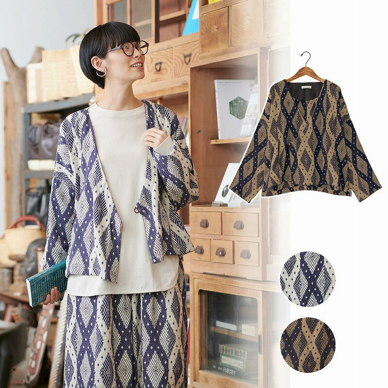 着物風のV明きジャケット。甚平のように内側と外側にあるボタンで留めることができます。前を開けて羽織りとしても着られるデザインです。前端の無地部分が見えるのもおしゃれ♪・生産地:インド・サイズ:約着丈SNP〜62cm、バスト114cm・素材:綿ジャガード、起毛ツイル綿100%ブルー品番:22522-331-082JANコード:4573279401596