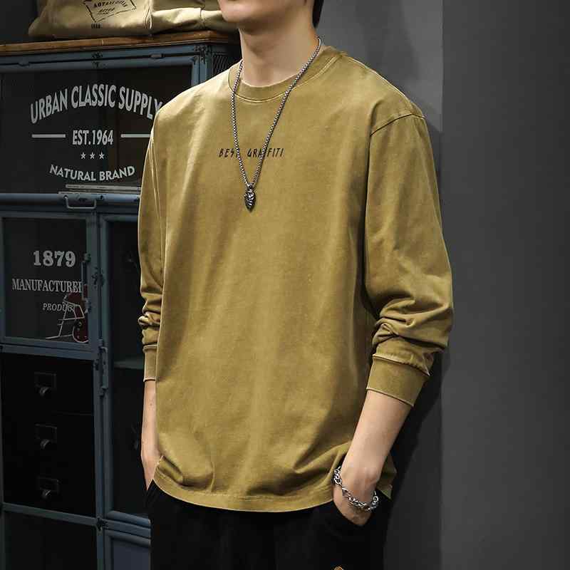Tシャツ 男性用 ビッグシルエット 長袖 トップス ラウンドネック ウォッシュ加工 リラックス 普段使い 秋 重ね着