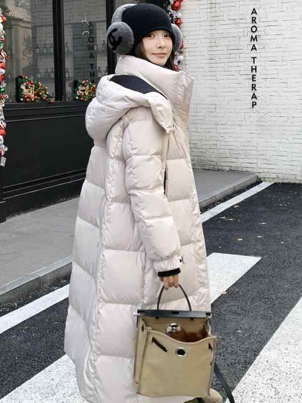 ダウンコート レディース 韓国スタイル 秋冬 ウエストマーク フード付き ロング丈 膝下 ゆったり ダウン ポリエステル 防寒 通勤 デイリー アウター ピンク アイボリー