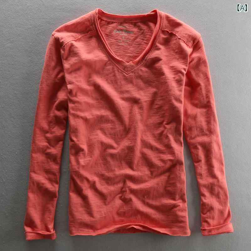 tシャツ メンズ vネック タイト 細身 長袖 春夏 薄手 竹 綿 スリムフィット コットン ソリッドカラー レッド ブラック グレー