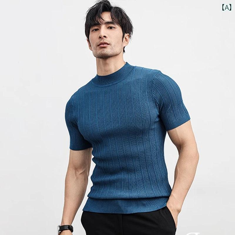 ニット メンズ 半袖 セーター ハイネック トップス リブ Tシャツ 夏 薄手 タイト 韓国 おしゃれ カジュアル 大きいサイズ ブルー グレー ブラック