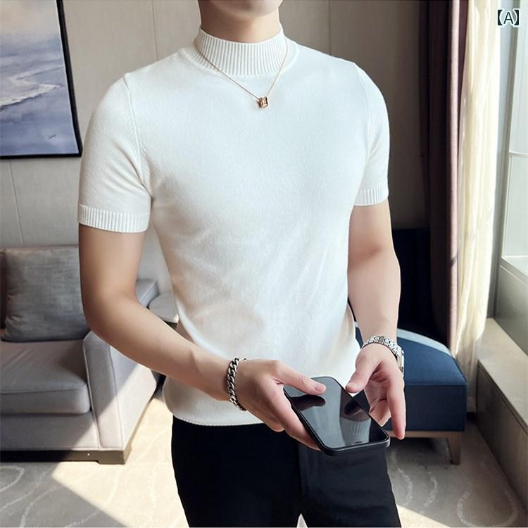ニット メンズ 半袖 セーター ハイネック トップス 春秋 ファッション シンプル タイト Tシャツ 韓国 大きいサイズ ホワイト グレー ブラック