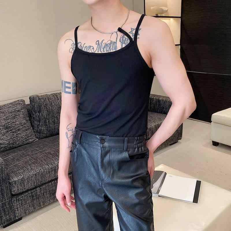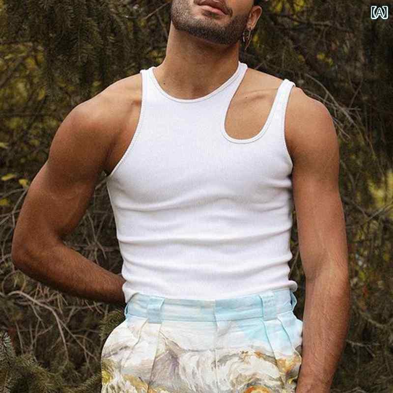 タンクトップ メンズ カットアウト セクシー 夏 ノースリーブ タイト フィット 白 紫 黒 無地 シンプル 大きいサイズ 薄手