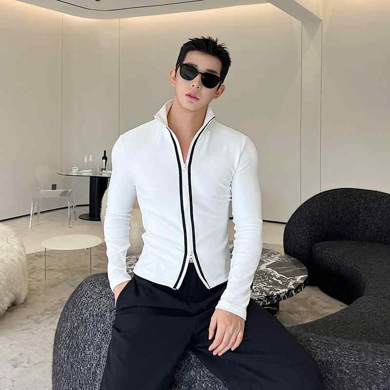 シャツ メンズ 秋 冬 長袖 トップス タイト T ダブル ジッパー ハイエンド コントラスト ハイネック カーディガン