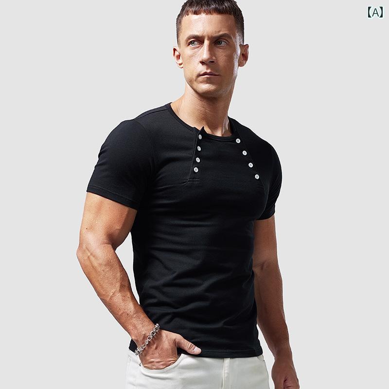 メンズ T シャツ マッスル スタイリッシュ ダブルブレスト ヘンリー カラー 半袖 春秋 薄手 綿 スリム タイト ヘンリーネック