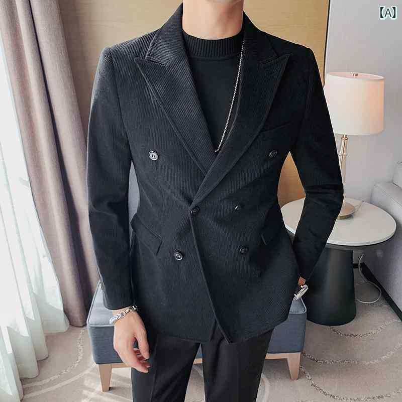 コーデュロイ ジャケット メンズ ダブル 紳士 スーツ 秋冬 厚手 タイト 韓国 ファッション 大きいサイズ ブラック ブラウン グレー