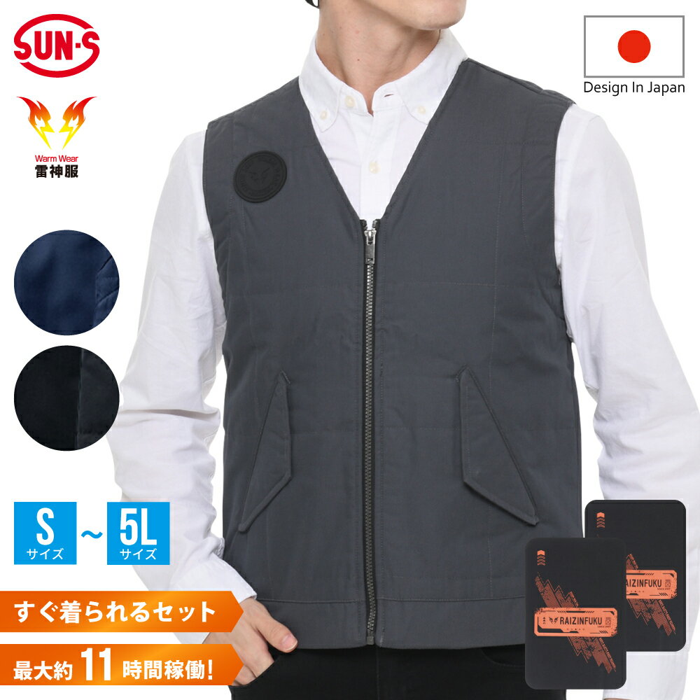 ブランド紹介 雷神服Ⓡ電気の力で即座にウェア内部から温める冬のワークウェアの鉄板的シリーズ。体に密着し保温性も抜群。過酷な冬の現場を耐え抜く頼もしき相棒。 商品仕様 外出時の寒さで悩む冬の味方になる、防寒服『雷神服🄬』一式セット。屋外作業や現場作業はもちろん、日常的に寒さにさらされるすべての人におすすめの商品です。必要アイテムがセットになっているので、初めて購入する方でも安心。バッテリーは別売りです。ページ下部「使用可能バッテリーについて」から対応バッテリーをチェック。防水防寒性能を搭載した、アウトドアにも活躍する雷神防水防寒ジャケット! 《雷神服🄬 / BO32160》背中内側に発熱ユニット装着部分があるベスト。衿無し仕様で重ね着しやすく、ジャケットにすっきりフィットするインナー防寒ベスト。 《雷神服🄬発熱ユニット / RD9570》やわらかい生地が使われた柔軟にフィットする発熱ユニット。軽量なので、背中に装着してもかさばりません。スイッチを入れるとすぐに暖かくなり、シート面全体が均一に体を温めてくれます。また、ユニット内部の温度センサーが発熱部分の温度を自動調節することで、低温やけどの危険が軽減。バッテリーの消耗も抑えてくれるため、長時間の使用ができます。Bluetooth対応でスマホアプリからの温度操作が可能になりました。バッテリーやコントローラーを操作しなくても手軽に温度調節ができます。 ※バッテリー別売り。一部空調風神服シリーズバッテリーをお持ちであればご使用可能です。 【セット内容品番】雷神服®(BO32160)雷神服®発熱ユニット(RD9570)※バッテリーは別売りです。 連続稼働時間 設定 稼働時間(RD9590PJ/RD9580G使用時) 強(High) 1時間+弱(約8時間) 中(Middle) 1時間+弱(約9時間) 弱(Low) 約11時間 設定 稼働時間(RD9291J使用時) 強(High) 1時間+弱(約6時間) 中(Middle) 1時間+弱(約7時間) 弱(Low) 約9時間 ※強・中使用時、低温やけどに配慮した設計のため、1時間の連続運転で自動的に「弱」に切替わります。※使用環境(気候・着用状況など)や機械的(充電回数など)条件で稼働時間は変動します。※RD9243・RD9241をご使用の際は、上記の持ち時間とは異なりますのでご注意ください。※体調が思わしくない時の使用はおやめください。また、使用中に体の異常を感じた場合は、直ちに使用をやめてください。 使用可能バッテリーについて 当セットにはバッテリーは含まれておりません。発熱ユニット(RD9570)をご使用の場合は、以下のバッテリーをご使用ください。【24V仕様:リチウムイオンバッテリー】・RD9590・RD9490・RD9390・RD9580G 【12V仕様:リチウムイオンバッテリー】・RD9291・RD9290・RD9190 【出力2A:モバイルバッテリー】・RD9243・RD9241※上記バッテリー、もしくは出力2A以上のモバイルバッテリーをご使用ください。※ただし、全てのバッテリーとの動作を保証するものではありません。 素材/カラー展開/サイズ TCタフタ表:T/Cツイル(ピーチ起毛加工)/ポリエステル65%・綿35%裏:タフタ/ポリエステル100%中綿:ポリエステル100%カラー:ネイビー、グレー、ブラックサイズ:M、L、LL、3L、4L、5L 商品備考 送料無料対象商品配送時間指定対応可能※バッテリーは別売になります。※モデル画像は環境光の影響によりカラーが実物と異なって見える場合がございます。 平置きのカラー画像を御参考ください。※サイズは平置き、メジャー採寸のため多少誤差が生じる場合がございます。※注意事項・使用方法については、取扱説明書を事前に必ずお読みください。【用途/使用シーン】サンエス 雷神服Ⓡ 発熱ユニット 一式セット ベスト ピーチ起毛加工 水洗い可能 ネイビー グレー ブラック 男女兼用 ユニセックス メンズ レディース 男性 女性 秋 冬 寒さ対策 冬対策 防寒対策 スポーティ スポーツ アウトドア ジョギング ウォーキング キャンプ ワーク ワーキング 作業服 現場 運送 作業 通勤 通学 電車 自転車 バッテリー別売り