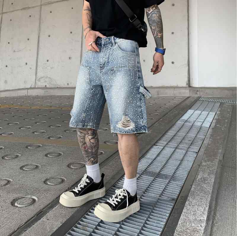 七分丈パンツ メンズ ブラック 総ラインストーン デニム ルーズ ストレート カジュアル ワークテイスト カーゴ 綿混 ストレッチ 夏 ストリートファッション