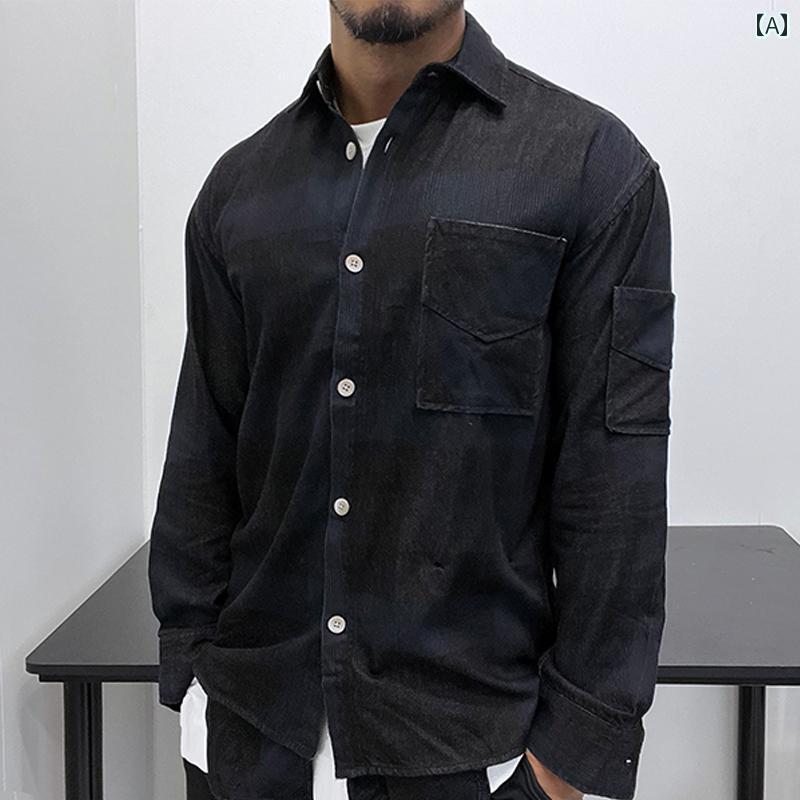 メンズ 肉 厚 質感 生地 スリムフィット 長袖 チェック ダーク 柄 シャツ ジャケット 裾 ポケット