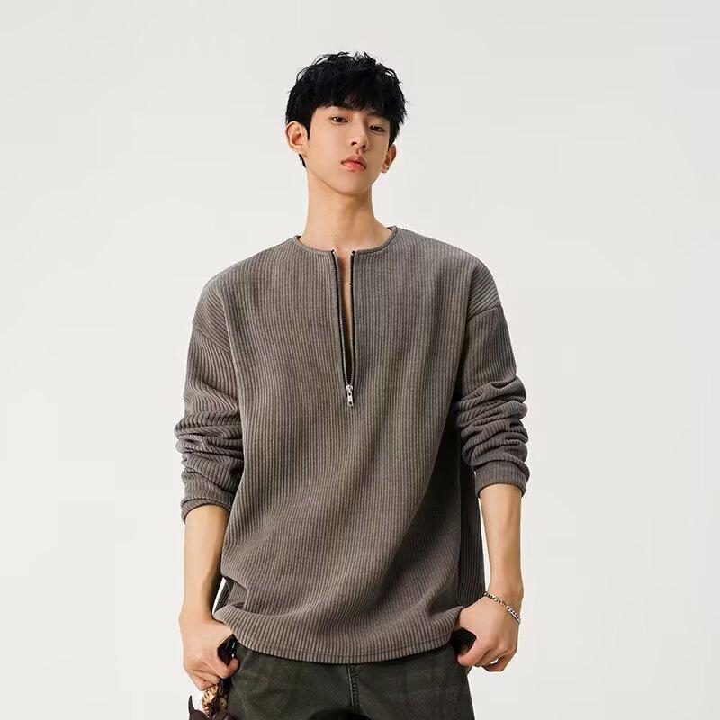 ・カテゴリ: スウェット/フリース・スタイル: ストリート系・タイプ: プルオーバー・主な素材: ポリエステル81~90%・生地: コーデュロイ・ネックライン: クルーネック・袖丈: 長袖・フロント: ジッパー・柄: 無地・: ステッチ・フィット: ルーズフィット・加工: アイロン不要・カラー展開: ブラック、ダークグレー、アプリコット・サイズ展開: M、L、XL、XXL、3XL・対象: 若年層・成人・性別: メンズ・重さ: 約250~300g未満