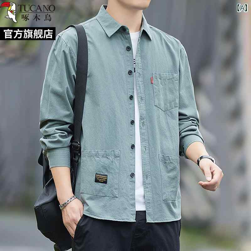 シンプル メンズ Yシャツ ウッドペッカー 100 % 綿 シャツ メンズ 長袖 2025 春秋 カジュアル ワークウェア ジャケット