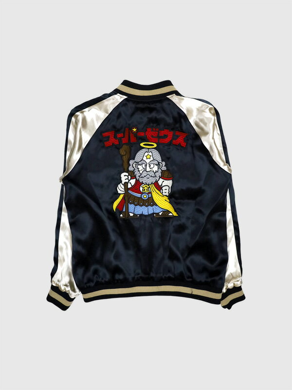 ビックリマン スカジャン メンズ レディース スーパーゼウス ブラックゼウス ビックリマンシール 刺繍 全能 神 切り札 悪魔 VS 天使 悪魔 お守り 天使 始祖ジュラ シール グッズ ロッテ ビックリマンプロジェクト BIKKURI-MEN Zeus BKM-2501