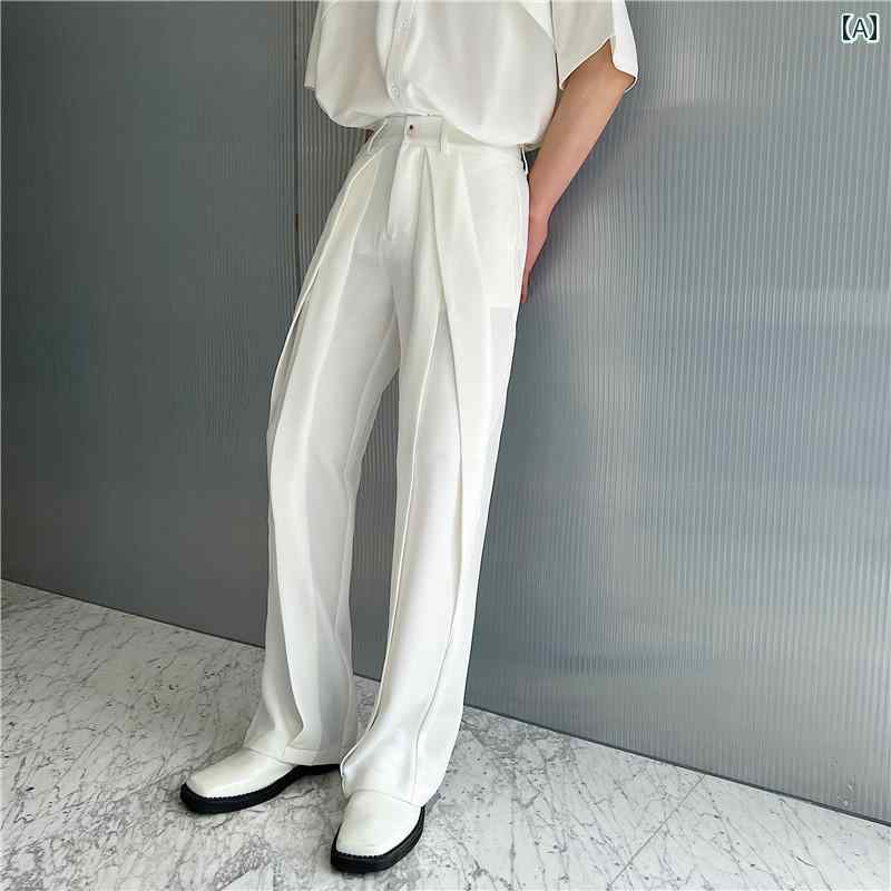 メンズ 夏 パンツ スラックス 高級感 白い ズボン ゆったり サイド プリーツ ワイド レッグ 春用 薄手 床丈