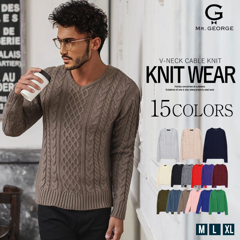 イケオジ ニット セーター メンズ 40代 ファッション おしゃれ 50代 60代 ミスタージョージ 大人 ブランド ケーブル編み Vネック 長袖 ニットソー インナー 中年男性 ケーブルニット カジュアル シンプル 無地 ルームウェア 大きいサイズ 黒 秋 冬 秋冬 【DTK】