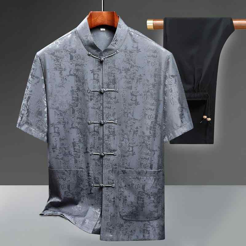 シャツ 男性用 薄手 半袖 Tシャツ ブラウス 唐装 接触冷感 抗シワ 普段使い 部屋着 父 祖父 高齢者向け・スタイル: スポーツ・厚さ: 普通・パンツ丈: 短パン・トップススタイル: Tシャツ・トップス袖丈: 長袖・素材: 綿・カラー: グレー, 深青, 赤・サイズ: 170/39, 175/40, 180/41, 185/42, 190/43, 195/44・製品カテゴリ: メンズカジュアルセットアップ