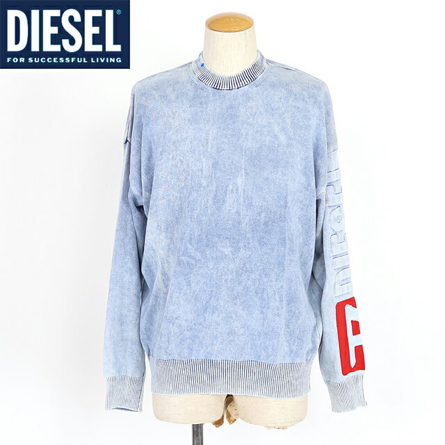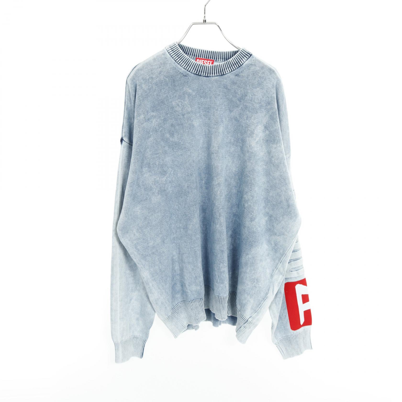 ディーゼル(DIESEL)メンズ 訳あり ニット クルーネック ブルー系 K-ZEROS 袖ロゴデザイン ウオッシュデニム イタリア製 (サイズ/S)*dm0120
