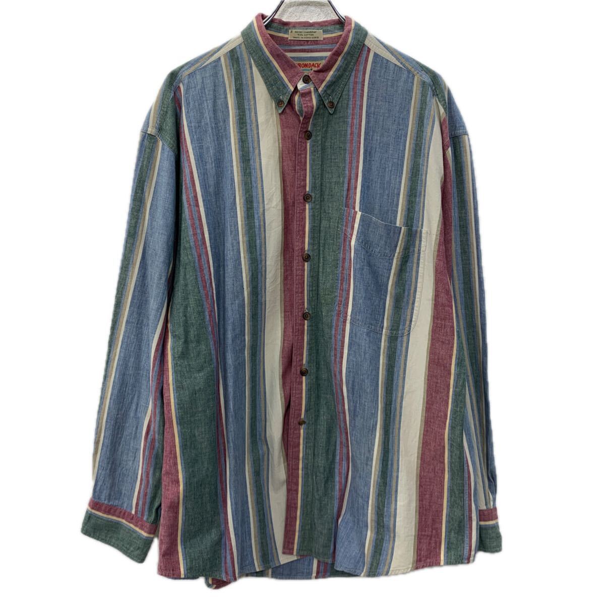 【中古】【古着】 ADIRONDACK 長袖 ストライプシャツ L エンジ マルチカラー ボタンダウン ボタン コットン100% 胸ポケット ストライプ 春物 a711-5782