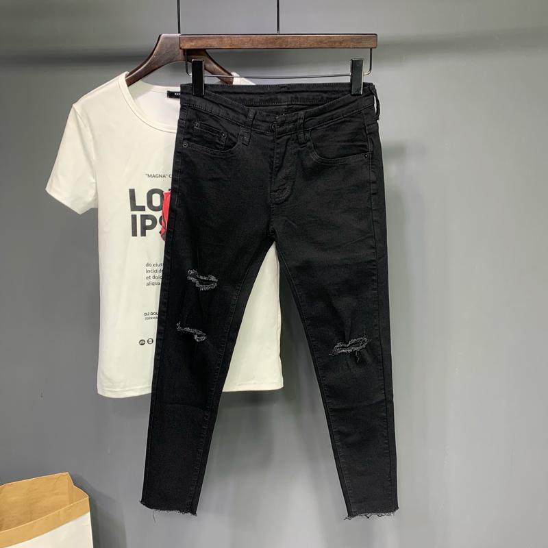 秋冬 コーデ メンズ 服 シンプル ファッション オシャレ 大人 かっこいい 大きいサイズ ストリート 紳士服 ワン リップド ジーンズ ブラック スリム フィット ストレッチ 韓国スタイル 快適 九分丈 パンツ