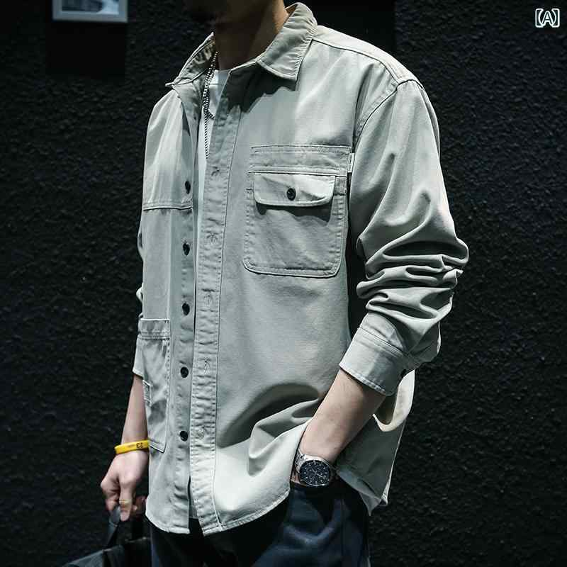 春秋 綿 長袖 シャツ メンズ 大きめサイズ カジュアル ワークウェア ジャケット レジャー ゆったり ポケット ボタン 無地 シンプル