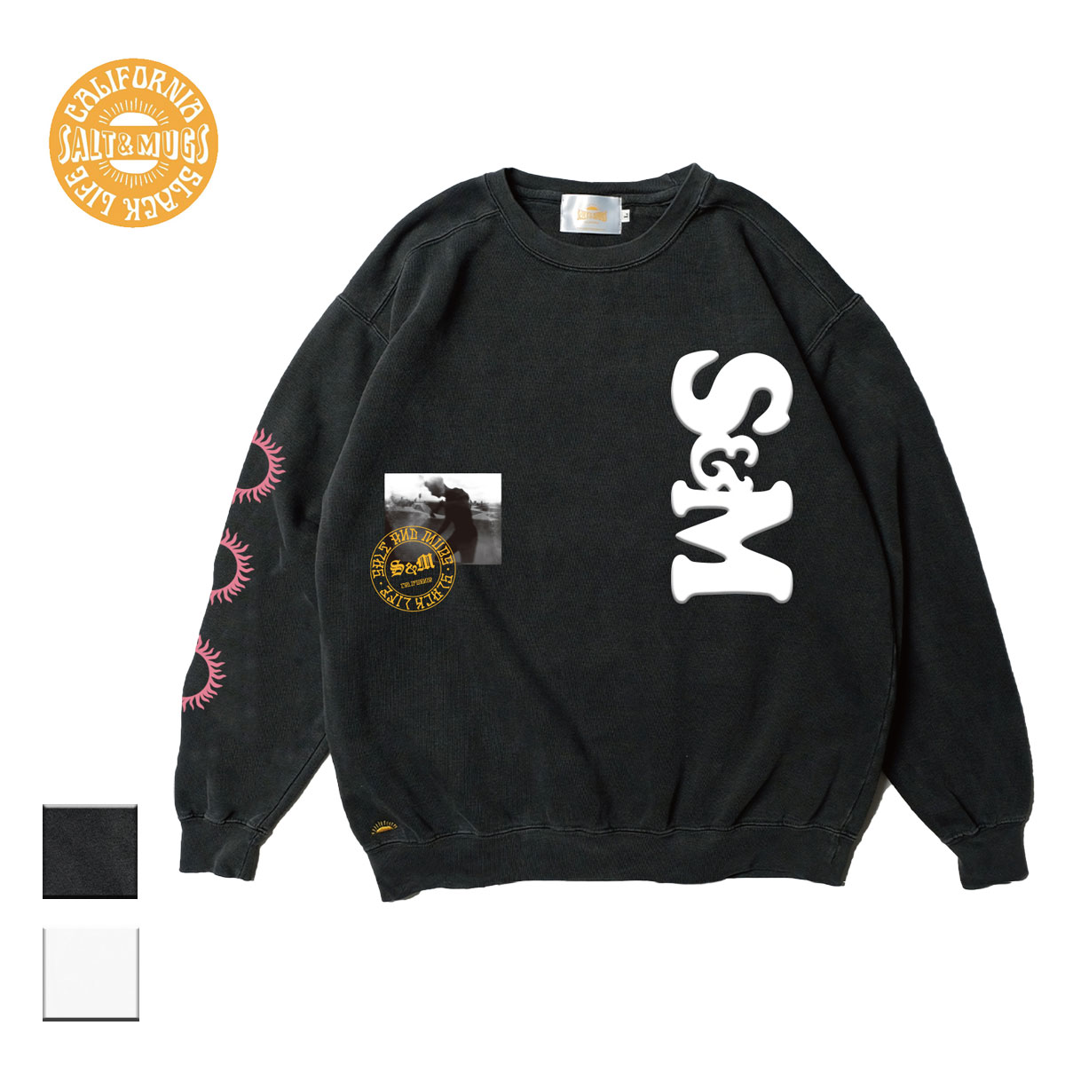 【送料無料】 SALT&MUGS ソルトアンドマグス MULTI CREW SWT メンズ/レディース ブラック/ホワイト M-XL SWT008 【トレーナー スウェットトレーナー スウェット スエット 袖プリント ロゴ カリフォルニア ロサンゼルス サーフ スケート おしゃれ ブランド 黒 白】