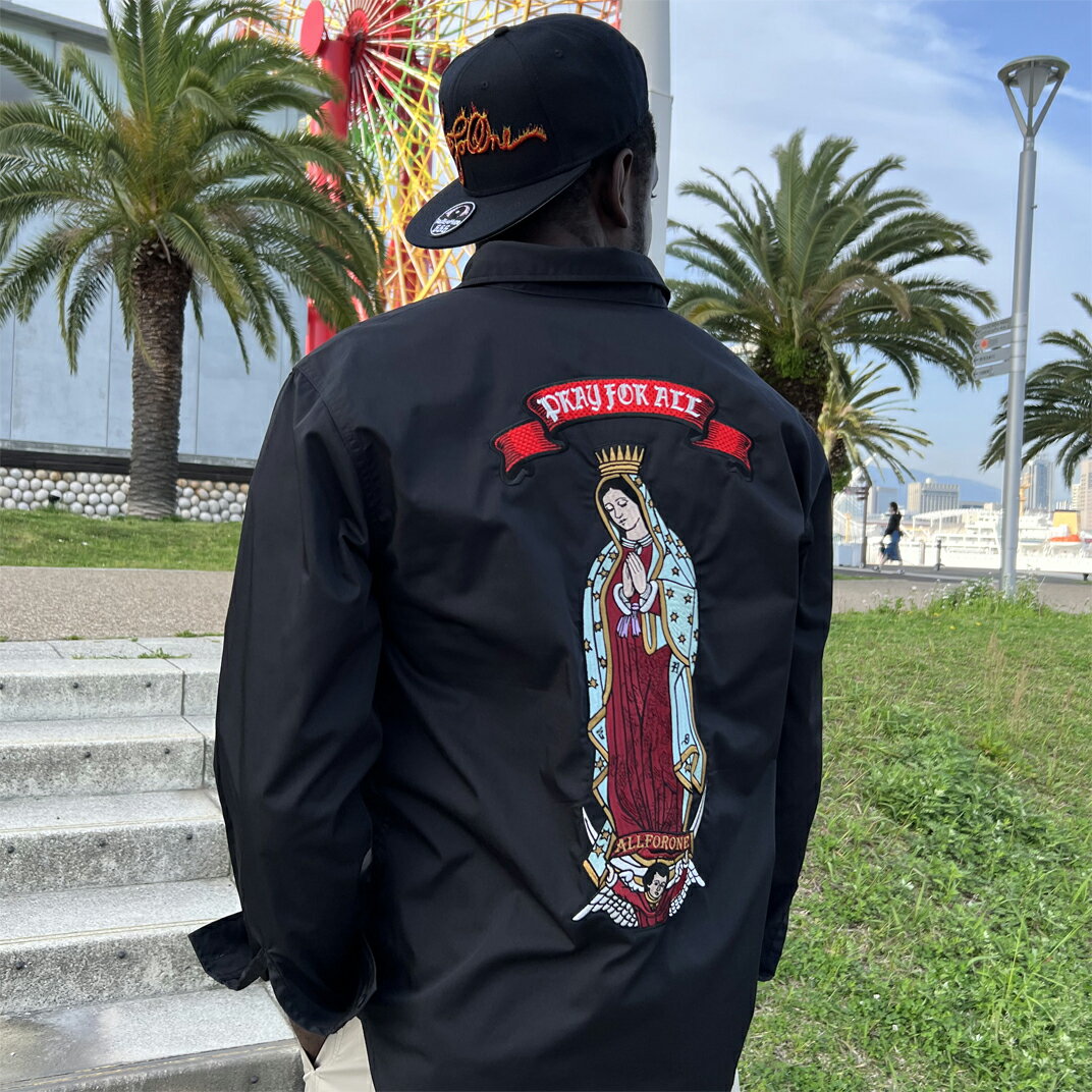 オーダー頂いてからの生産となります。 お届けまで約 3〜7日程頂いております。またコチラの商品オーダー後のお客様のご都合によるキャンセル、変更はお受けしておりません。ご注文の際、十分にご注意下さい。 全て刺繍という拘りの逸品 AFOが誇る技術で一本一本繊細に針運びされた絶品刺繍 【MODEL】FEMALE / ANKA 169cm / XL 【素材】綿35%/ポリ65% 【サイズ】着丈/身幅/袖丈(cm) M:75/54/22 L:78/57/23 XL:81/60/24 2XL:84/63/25 3XL:84/67/26 4XL:86/71/26 5XL:86/75/27 【マーキングサイズ】刺繍 Fear nothing(左胸)刺繍 【サイズ】約 2.8cm x 10cm 何も恐れない ・PRAY HAND(右腕)刺繍 【サイズ】約 15cm x 10cm プレイングハンズ:ルネサンス期のドイツでデザインルーツされた『プレイングハンズ』アルブレヒト・デューラー『祈る手』 ・PRAY FOR ALL(背中上)刺繍 【サイズ】約 9,6cm x 25cm すべての人のための祈り ・聖母マリア(背中下)刺繍 【サイズ】約 40cm x 15cm キリストの母 Holy Mother、Saint Mary(聖女マリア)