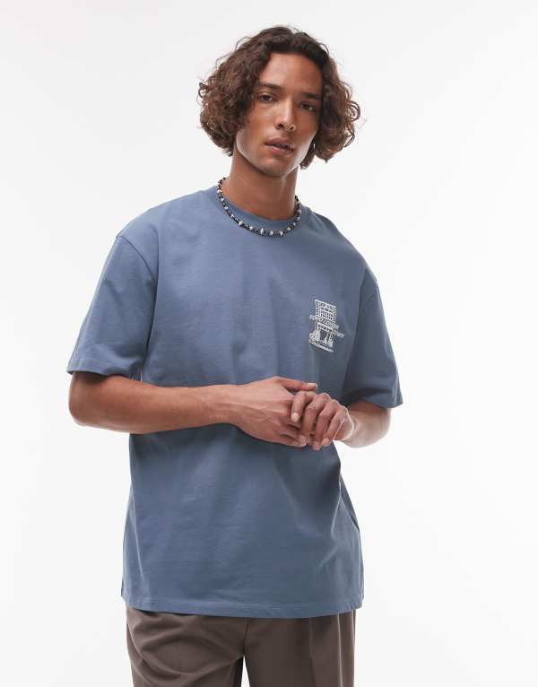 トップマン メンズ トップス Tシャツ オーバーサイズフィット プリント シャツ Topman oversized fit T-shirt with front and back Soho print Dark blue ブルー