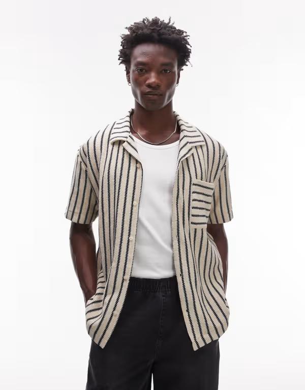 トップマン メンズ トップス シャツ オーバーサイズフィット ニット ジャージー Topman oversized fit button through jersey shirt with knit stripe in stone STONE ストーン