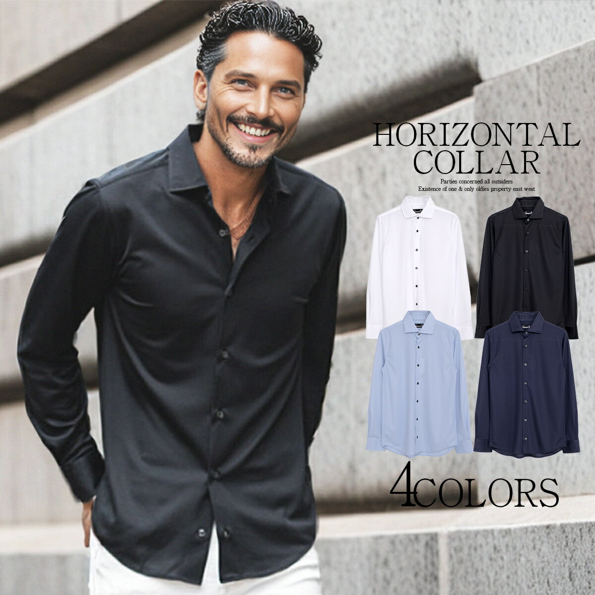 イケオジ ホリゾンタルカラー 長袖シャツ メンズ 40代 ファッション おしゃれ 50代 60代 ミスタージョージ ブランド 大人 速乾吸収 長袖 Yシャツ シンプル 無地 カジュアル 開き襟 ビジネス ホワイト ブラック 服 【郵】