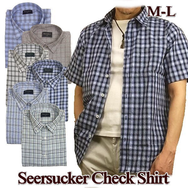 カジュアルシャツ 半袖 メンズ 夏物 シアサッカー レギュラーカラー ボタンダウン 綿混 チェック ストライプ M L LL