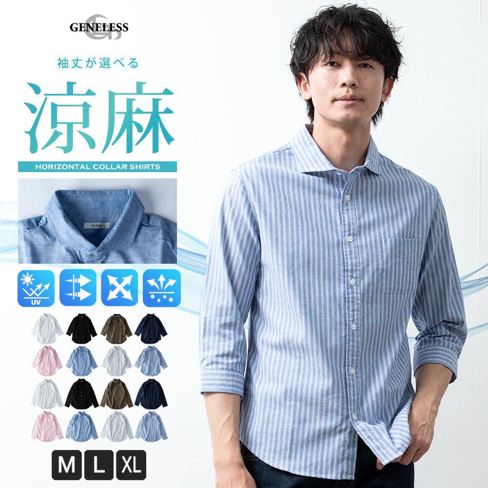 メンズ シャツ 長袖 7分袖 リネン おしゃれ 春 夏 涼しい 綿麻シャツ ストレッチ コットンリネン 生地 無地 カジュアルシャツ 春物 ホリゾンタルスクエア ブラウス 全8色 32809 32810 ジェネレス