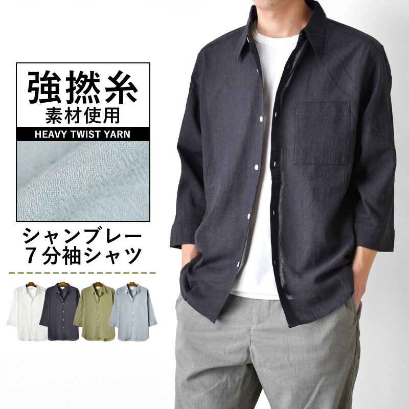 シャツ メンズ 七分袖 シャンブレー 強撚糸 ポケット付き【ゆうパケット送料無料】【ゆうパケット送料無料】【2-B7C】